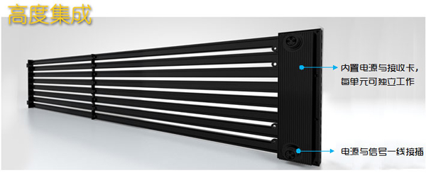 高度集成(内置电源与接收卡,每单元可独立工作;电源与信号一线接插)。